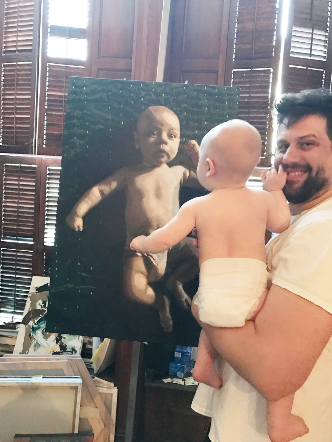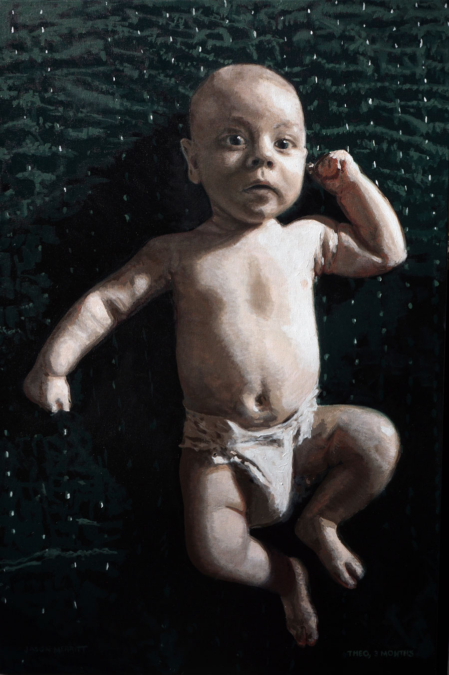As a new dad, Jason was struck by the ephemeral nature of his son’s childhood, captured in thousands of photos that, by and large, never left his phone. He was inspired by one particular photo of his infant son lying on a rich, green velvet tapestry and decided to translate the photo into a formal portrait – much to his wife’s delight.